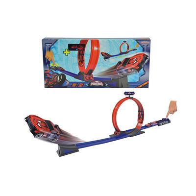 Die Spiderman Loop'n' Jump ist eine 94 cm große Looping Bahn für 7,5 cm große Fahrzeuge. Mit nur einem kurzen Push auf den Starter des Launchers und die kleinen Fahrzeuge werden in den Looping katapultiert. Im Set ist alles inklusive Zubehör, Rampe und 1 Spiderman Fahrzeug zum sofortigem Losspielen vorhanden.