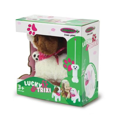 Dieser kleine Freund darf in keinem Kinderzimmer fehlen. Lucky und Trixi sind die treuen Begleiter und laufen per Fernsteuerung vorwärts und rückwärts. Bellen, Laufen und Wedeln fast wie ein echter Hund.