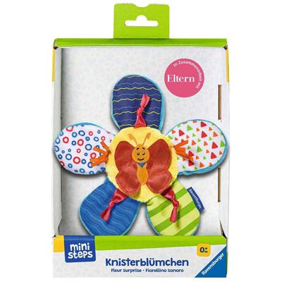 Das kuschelweiche Knistertuch lädt mit farbenfrohen Mustern, abwechslungsreichen Materialien und spannenden Spieleffekten zum Entdecken ein. Die Blütenblätter faszinieren mit Knistergeräusch und Granulatfüllung, und um den wunderschön glänzenden Schmetterling reihen sich bunte Nuckelbändchen zum In-den-Mund-Nehmen. Der flauschig-weiche Plüsch auf der Rückseite animiert immer wieder zum Kuscheln und Schmusen. Das alles macht das Knister-Blümchen schnell zu Babys heißgeliebtem ständigen Begleiter.