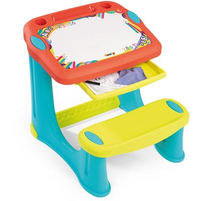 Dieser Schul- und Arbeitstisch im kindgerechten Design ist aus hochwertigem Kunststoff gefertigt und daher besonders stabil. Durch seine ergonomische Formgebung ist der Kreativtisch bereits für Kinder ab 2 Jahren geeignet. Durch die leichte Schräglage der Tischplatte haben die Kinder die perfekte Position, um zu malen und zu schreiben. Zu der Ausstattung gehören eine integrierte Sitzbank, eine Fußablage und eine Schreibplatte, auf der man seiner Fantasie freien Lauf lassen kann. Unter der Platte befindet sich zudem eine herausziehbare Schublade, in der Stifte oder anderes Zubehör perfekt verstaut werden können. Die spezielle IML-Technologie sorgt für eine lange Haltbarkeit des farbenfrohen Motivs auf der Arbeitsplatte. Inklusive 10 Malvorlagen, einem abwischbaren schwarzen Malstift sowie einem Schwamm.