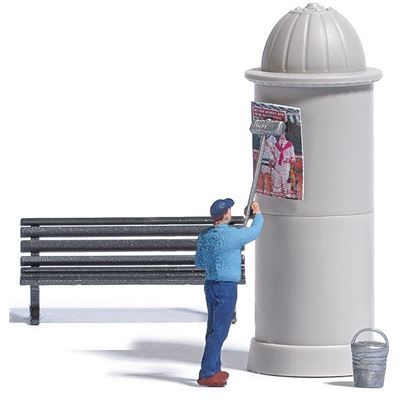 Action Set für die realistische Belebung Ihrer Modellwelt. Mann, der ein Plakat anklebt. Mit Litfaß-Säule, Eimer und Parkbank.