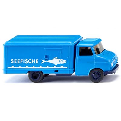 Details: Fahrerhaus mit Kühlwagenaufbau und abnehmbaren Dach himmelblau. Fahrgestell und Felgen saphirblau. Fenster topaz getönt. Frontseitiger Opel-Schriftzug sowie Logo und Scheinwerfer gesilbert. Steg saphirblau, Blinker verkehrsorange bedruckt. Kofferaufbau mit weißem Seefische-Schriftzug und -Logo. Zwei weiße Stapelkästen mit Seefische-Logo saphirblau bedruckt befinden sich im Kofferaufbau.