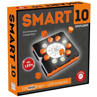 Smart 10 Spotlight von Piatnik bringt frisches Licht in den Quizspaß – im wahrsten Sinne des Wortes. Diese Edition kombiniert den bewährten Spielmechanismus der Smart 10-Reihe mit einer neuen Funktion: Die integrierten LEDs in der Smartbox ermöglichen es, auch im Dunkeln zu spielen – sei es bei nächtlichen Spieleabenden, im Zelt, in der Kneipe oder unter der Decke. Das kompakte Format und die Beleuchtung machen das Spiel noch flexibler und mobiler.