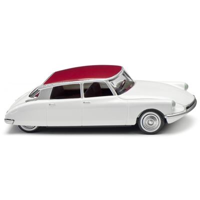 Die elegante Limousine Citroën ID 19 zeigt sich mit klarer Farbwahl: Die Karosserie ist strahlend weiß mit feinem Klarlackfinish, das Dach in kräftigem Rubinrot, das Interieur inklusive Lenkrad in edlem Weinrot. Dieses Zusammenspiel von Weiß und Rot macht das Modell zu einem stilvollen Beispiel automobilhistorischer Ästhetik.