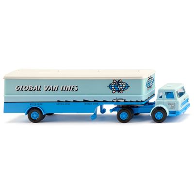 Die Sattelzugmaschine zeigt sich mit einem weißblauen Fahrerhaus, einer hellblauen Inneneinrichtung sowie einem hellblauen Fahrgestell. Die Trilex-Felgen, Stützrollen und hinteren Kotflügel sind farblich passend in Hellblau ausgeführt. Die silberne Sattelplatte sowie gesilberte Scheinwerfer ergänzen die Zugmaschine mit feinen Akzenten. Auf den Türen prangt der Schriftzug „Global Van Lines“ – ein historischer Verweis auf die traditionsreiche Spedition.