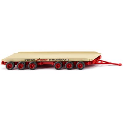 Die Rampe des Straßenrollers ist in grünbeige gehalten, die Deichsel in kräftigem Feuerrot. An den Flanken finden sich mehrfarbig aufgedruckte Schriftzüge „Spedition Pieper Schwertransporte“ in Schwarz und Rot – ein deutlicher Verweis auf die langjährige Schwerlastkompetenz des Dortmunder Unternehmens Pieper, das bereits 1901 gegründet wurde. Zwei zusätzliche, feuerrote Deichseln liegen dem Modell separat bei und ermöglichen unterschiedliche Rangierpositionen. Die Bauweise und Detaillierung der Straßenrollerlafette orientieren sich eng am Originaleinsatz in der Speziallogistik.