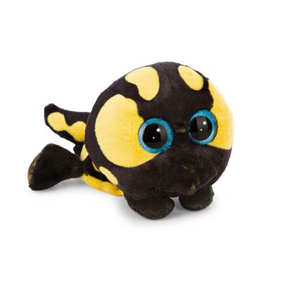 Seine lebhafte Farbgebung in Schwarz und Gelb macht Fyrin zu einem echten Blickfang und hebt ihn deutlich innerhalb der GLUBSCHIS-Welt hervor. Ein besonderes Highlight sind die großen, funkelnden blauen Glitzeraugen, die dem Feuersalamander einen freundlichen, neugierigen Ausdruck verleihen. Liebevoll gestaltete Details und die sorgfältige Verarbeitung unterstreichen die hohe Qualität dieses besonderen Plüschtiers.