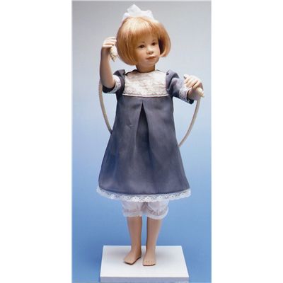 Ihr Puppenkörper ist vollständig aus Porzellan und durch den 6-gliedrigen Körper in allen Teilen beweglich. Die Perücke ist aus Echthaar und kunstvoll frisiert.