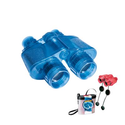 Fernglas aus ABS Kunststoff mit Umhängeband und Aufbewahrungsbehälter. Regulierbarer Fokus und Augenabstand (49 - 78 mm). Technische Daten: Objektivdurchmesser 35 mm, 4 optische Elemente, 3,5-fache Vergrösserung. Fokus Regulierer. Farbe blau/rot transparent. Masse: 16.5 x 18 x 7 cm.