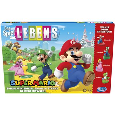 „Das Spiel des Lebens“ für Super Mario Fans! Hier flitzen die Spieler mit Mario, Peach, Luigi und Yoshi um den Spielplan und reisen durch das Pilz-Königreich, bevor sie schließlich die Scheibe drehen, um den Kampf gegen Bowser zu gewinnen. Während die Spieler über die geschlängelten Wege des Spielplans ziehen, gilt es, Münzen zu sammeln, sich mit Items auszustatten, Freunde hinzuzurufen und lustige Minispiele wie „Schere, Stein, Papier“, „Daumenringen“ und „Drehduell“ zu absolvieren. Sobald sie sich Bowsers Festung nähern, kann durch das Kaufen von Sternen die Drehkraft erhöht werden. Jeder Stern fügt 1 Punkt der Drehkraft hinzu und um Bowser zu bezwingen, muss eine 12 oder höher gedreht werden, denn nur dann kann man das Spiel gewinnen. Dieses unterhaltsame Spiel eignet sich für Kinder und Familien, für 2 - 4 Spieler ab 8 Jahren.