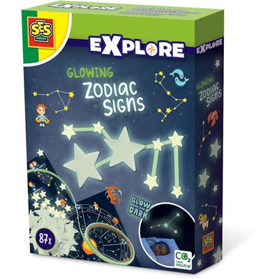 Das Set enthält 40 Plastik-Sterne und 46 Aufkleber, die im Dunkeln leuchten, 3 Meter Klebeband, das im Dunkeln leuchtet, 1 Anleitung mit Informationen über alle Sternzeichen. Ab 5 Jahren geeignet.