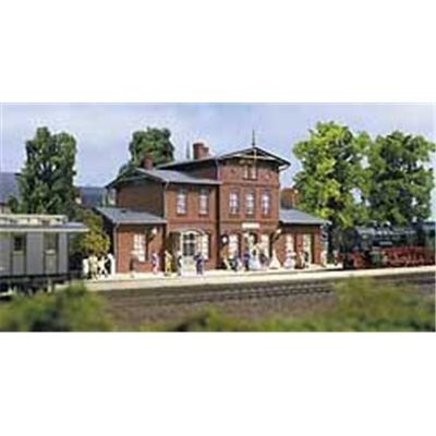 Als Vorbild für dieses Modell diente das Bahnhofsgebäude 'Krakow am See' an der Strecke Güstrow- Plau-Pritzwalk. Das Empfangsgebäude hat typische preußische Architekturmerkmale, wie Ziegelsteine als preiswertes Baumaterial und sparsamste Verzierung nur durch erhabenes Mauern. Das Modell ist so konzipiert, dass zwei verschiedene Epochen dargestellt werden können. - Anbau in Holzkonstruktion Epoche I, massiver Anbau ab Epoche III liegen bei. Ebenso die passenden Lampen und Uhr. Besonderer Wert wurde auf die Originalität der Ziegeldarstellung gelegt. Ohne Bahnsteig.