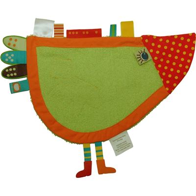 Dieses Tuch hat die Form eines Vogels. Einige Etiketten stellen die Flügel und Pfötchen dar, andere die Federn. Ein toller neuer Kuschelfreund für die Kleinen. Das Tuch wurde aus Frotteegewebe hergestellt, weil dieser Stoff von vielen Kindern als angenehm empfunden wird. Die Etiketten werden aus unterschiedlichen Materialen gemacht, wodurch der Tastsinn gefördert werden soll.