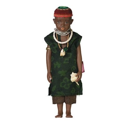 Joshua ist ein stolzer westafrikanischer Junge in einem naturfarbenen Leinenanzug mit authentischen Mustern. Um den Hals trägt er Perlenschmuck und ein echtes Schneckenhaus als Talisman.